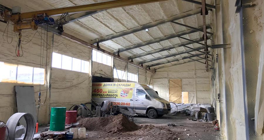 Рассмотрим метод утепления фермы с помощью технологии напыляемого пенополиуретана. Помимо основной задачи по сохранению тепла, напыляемый пенополиуретан способствует защите основных конструкций, защищая от корозии и износа
